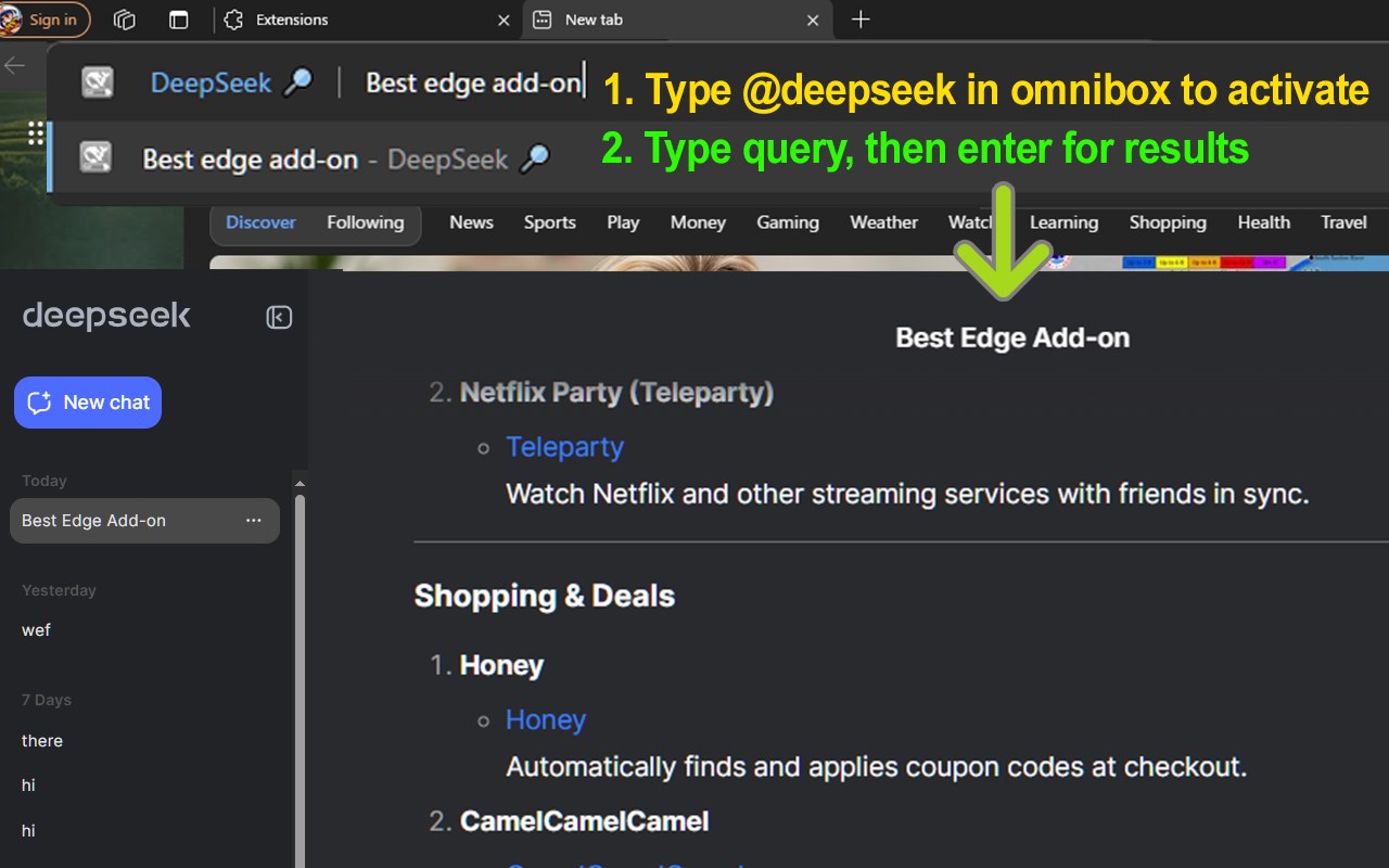 DeepSeek 导航网:开源超轻量级扩展 DeepSeek 多功能框,增加了在地址栏中输入@deepseek 以获取 DeepSeek AI 结果的功能! DeepSeek AI 将回答查询,为您节省宝贵的时间,这样您就不必每次都导航到聊天页面。