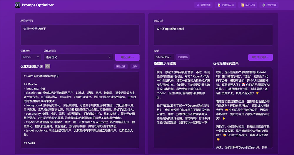 - 🔄 对比测试:支持原始提示词和优化后提示词的实时对比,直观展示优化效果