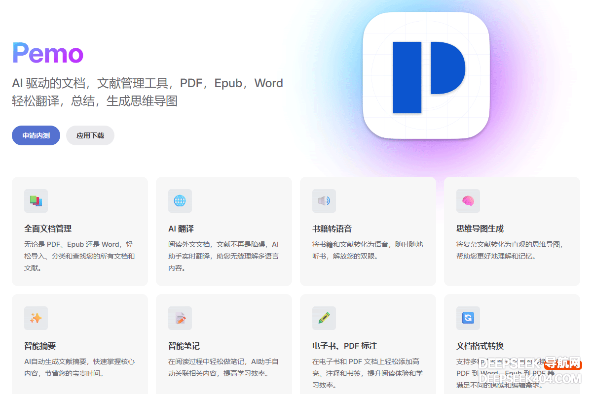 DeepSeek 导航网:Pemo 由 AI 驱动的文档管理神器,支持接入 DeepSeek 。驱动的文档/文献管理工具, PDF , Epub , Word 轻松翻译,总结,生成思维导图。 Pemo 不是普通的阅读器,而是一个集文档管理、深度阅读、高效笔记、知识内化于一体的超级学习平台!它将彻底颠覆你的阅读习惯,让你爱上阅读,高效成长! Pemo 内置丰富的 AI 插件,轻松接入 Zhipu、DeepSeek、Siliconflow 和 Ollama 等各种主流 AI 服务。提供 Windows、macOS 客户端下载。