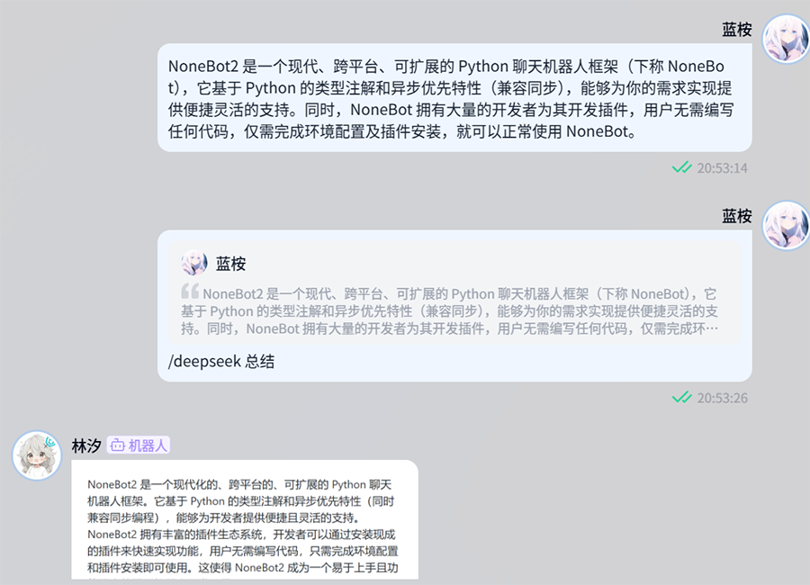 DeepSeek 导航网:NoneBot DeepSeek 插件。接入 DeepSeek 模型(申请 DeepSeek API),提供智能对话与问答功能。 NoneBot2 是一个现代、跨平台、可扩展的 Python 聊天机器人框架(下称 NoneBot),它基于 Python 的类型注解和异步优先特性(兼容同步),能够为你的需求实现提供便捷灵活的支持。同时, NoneBot 拥有大量的开发者为其开发插件,用户无需编写任何代码,仅需完成环境配置及插件安装,就可以正常使用 NoneBot 。