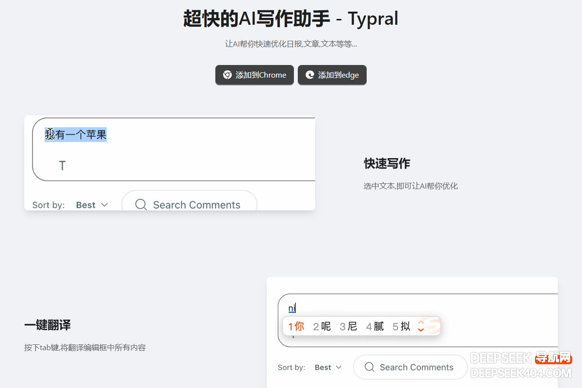 DeepSeek 导航网:Typral -超快的 AI 写作助手,安装后需要在 Edge 的插件设置中,将该插件选中下就可以了,然后在刷新下网页。让 AI 帮你快速优化日报,文章,文本等等,一键翻译按下 tab 键,将翻译编辑框中所有内容。