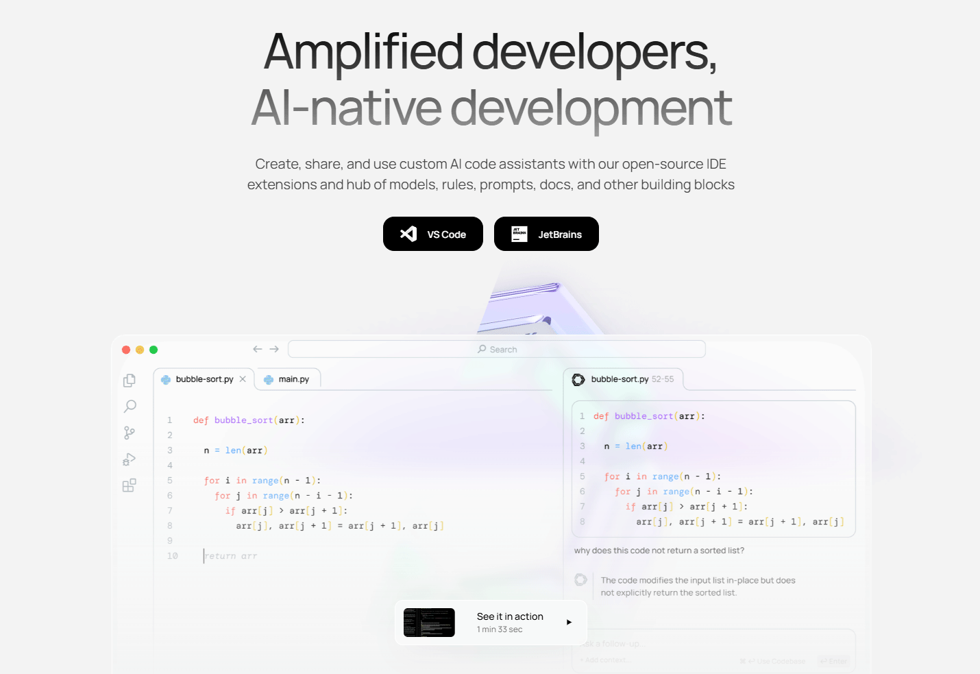 DeepSeek 导航网:Continue 是一款开源、可定制化的 AI 代码助手插件,专为提升开发效率设计,支持 VS Code 和 JetBrains 等主流 IDE 。它通过灵活集成多种 AI 模型和上下文数据源,帮助开发者实现智能代码补全、调试优化和自然语言交互。