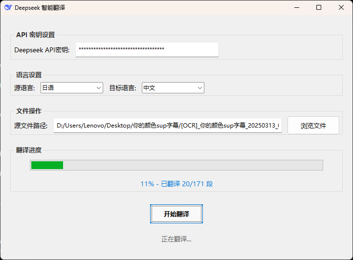 - 等待翻译完成,翻译后的文件将保存在原文件同目录下,文件名后缀为"_translated.txt"