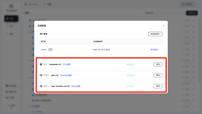 首次登录时会提示需要先配置 AI 模型,根据下方图片配置 “Chat 模型”。,例如:DeepSeek