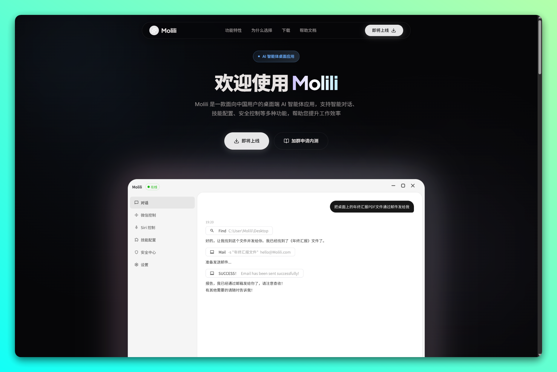 场景设想:你正在赶往机场的路上,突然想起一份核心报价单还没发给外籍客户。你直接在微信里对 Molili 说:“帮我找到桌面那个‘Q1 报价单.docx’,把它转成 PDF 并翻译成英文,然后通过 Outlook 发给客户张总,抄送给我一份。”