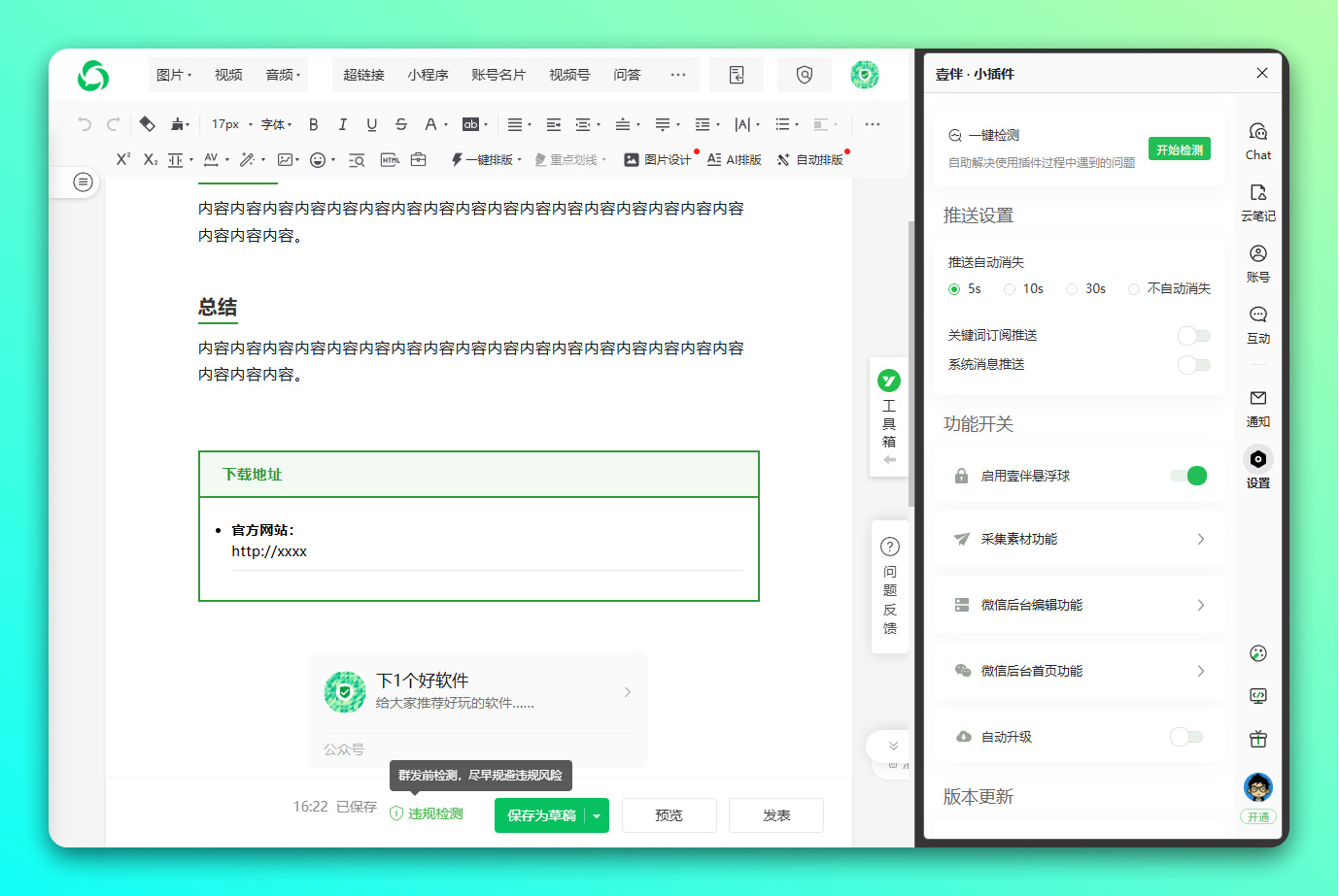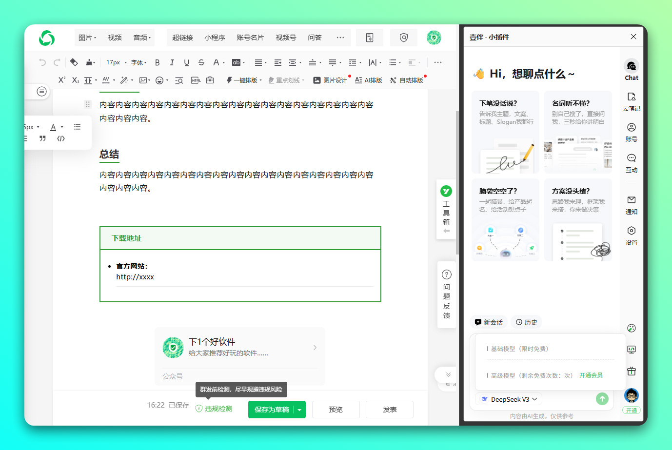 - AI 长文创作:借助 AI 的写作能力,助你以十倍效率完成长篇文章的撰写工作。根据公众号的调性和定位,智能生成契合公众号风格的文章内容,使创作过程更加轻松愉快。