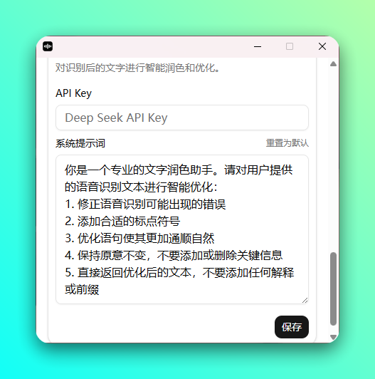 - 智能润色: 使用 DeepSeek AI 优化文本
