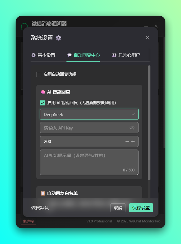 支持红包提醒通知、防撤回功能,首次使用需要到自动回复中心里面设置 AI 智能回复的 API 模型 和 API KEY ,支持 DeepSeek 的模型,然后设定初始化提示词以及自动回复的白名单。