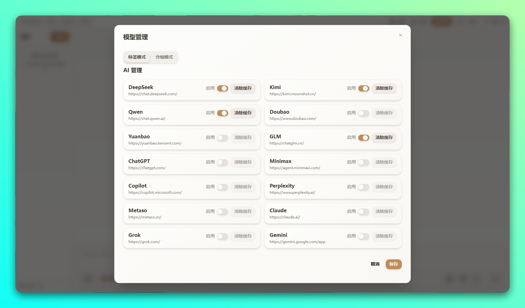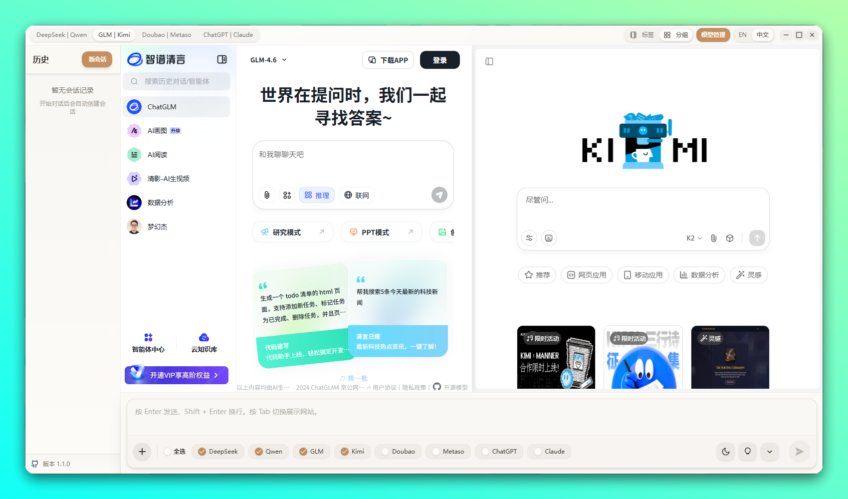 - 并行提问:一个问题,多个 AI 同时作答。不同的思路、不同的风格,并排呈现在你眼前。