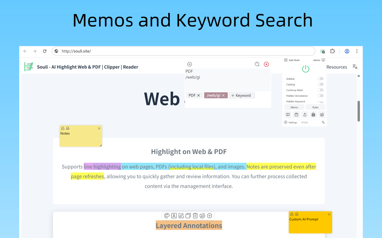 DeepSeek 导航网:支持 AI 的网页划线高亮 & PDF + 剪藏 Souli、智能网页剪藏与沉浸式阅读模式,并且数据均在本地处理。 AI 助手提供如: 智能摘要、上下文关联问答等功能 📣 它可以很好的帮助你在网页、 PDF 中进行划线高亮、标记、做笔记等,刷新后数据也能恢复过来。还可以对数据进行管理。并且数据在本地处理保障隐私安全并提升响应速度。
