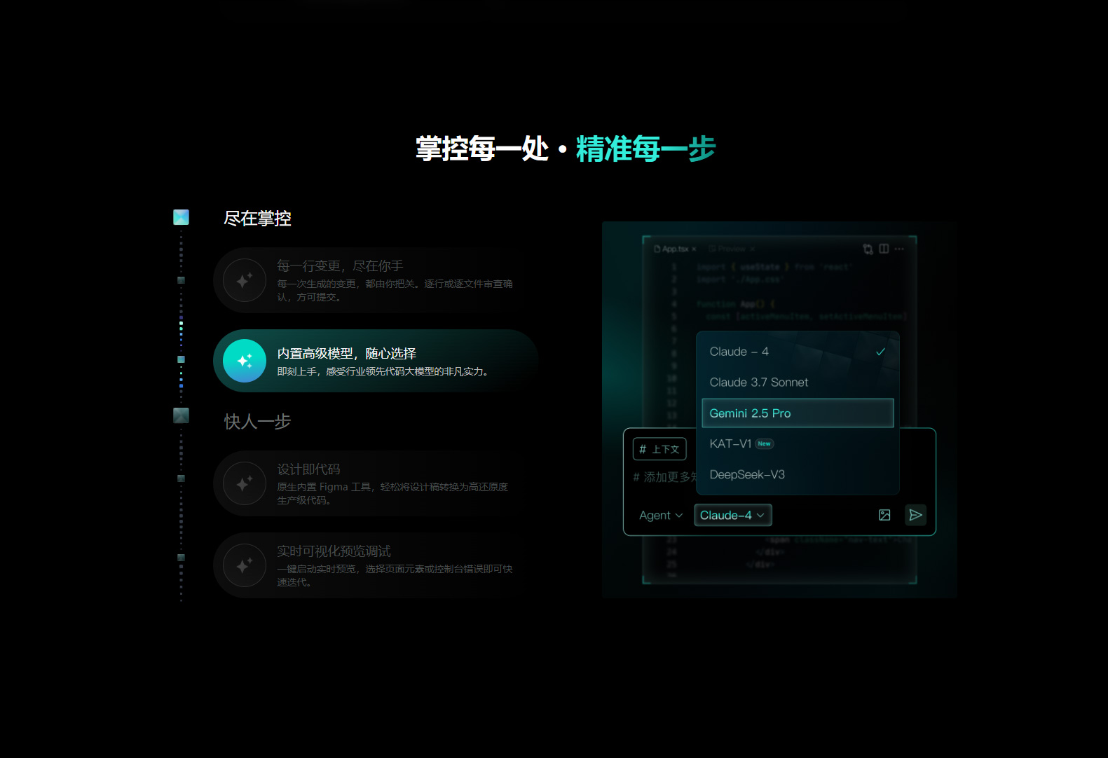 目前该模式支持快手自研的 KAT-Coder 模型和 Claude Sonnet4 模型,开发者可根据项目需求选择合适的模型,兼顾效率与适配性。