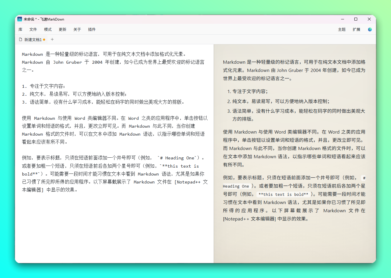 - 源码/所见双模式 - 双模式自由切换,源码模式支持分屏