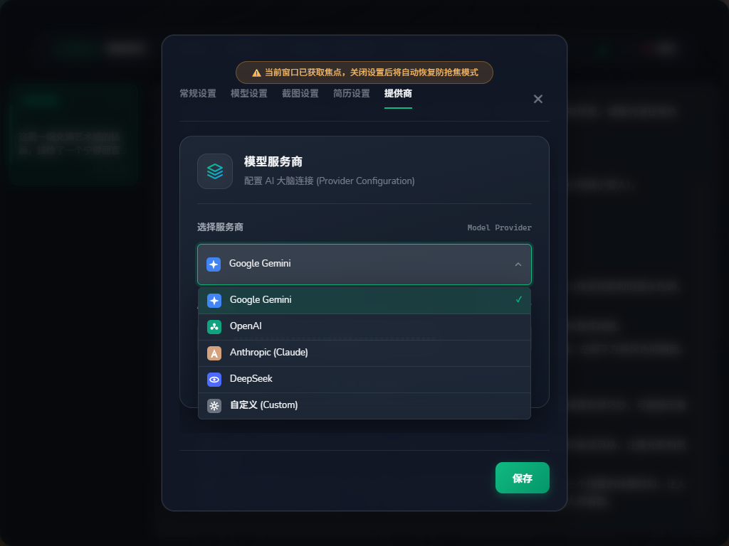 - 面试官模式:模拟真实技术面试场景,实时语音转录面试官问题,并由 AI 提供即时回答建议。