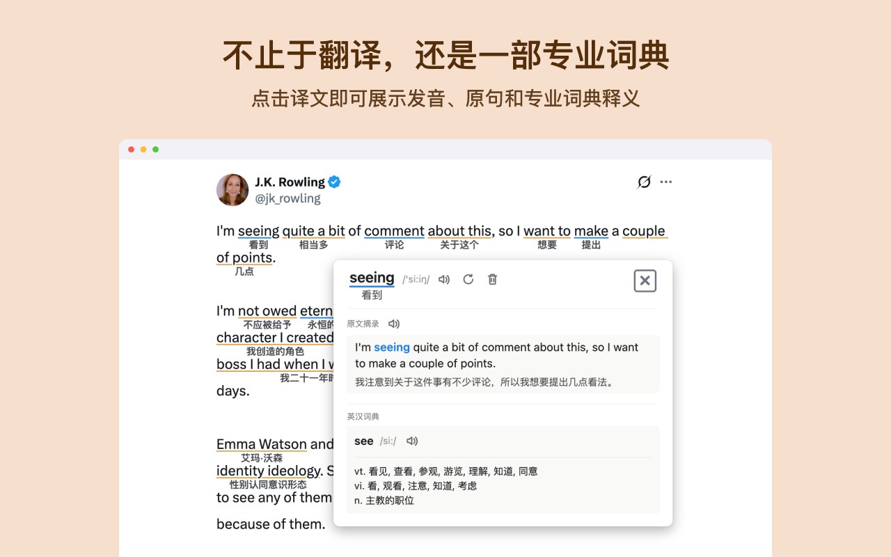- 笔记式翻译:翻译内容以字幕形式直接显示在原文下方。没有弹窗,不会跳转。就像在网页上做笔记一样,完全不会打断你的阅读节奏。
