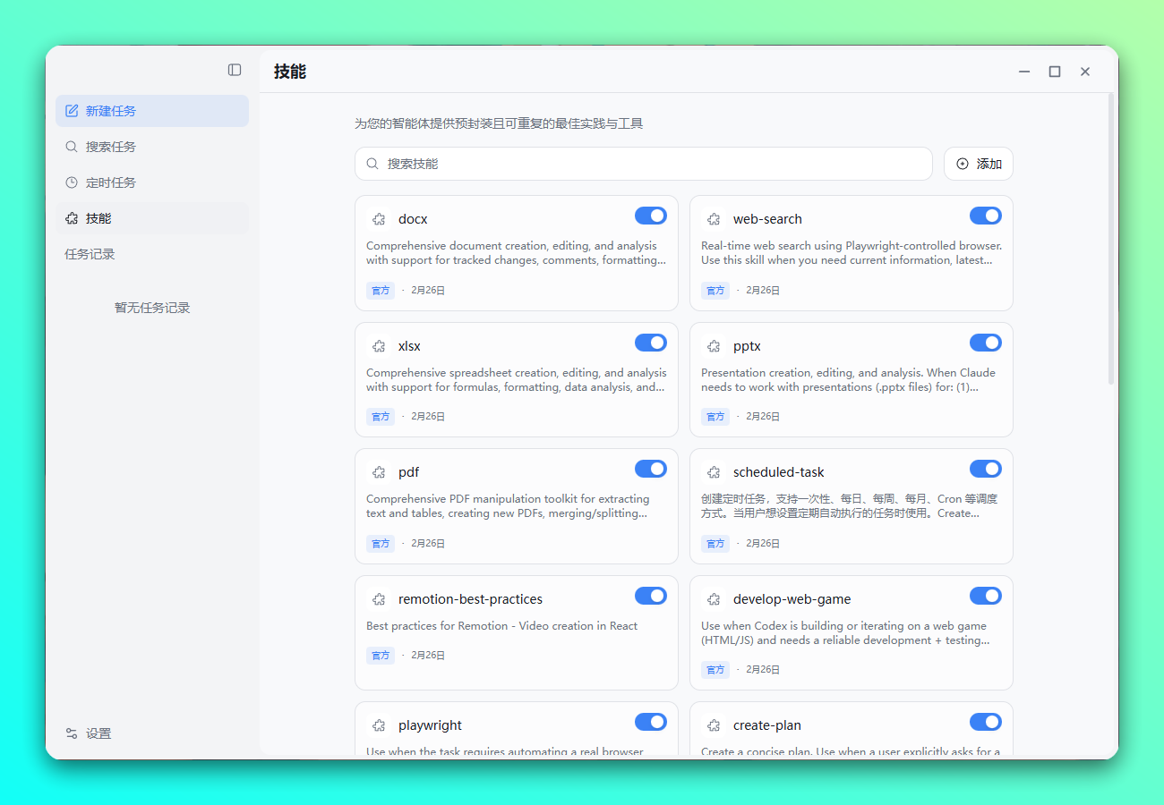 - 内置技能 — 包括 Office 文档生成、Web 搜索、Playwright 自动化、Remotion 视频生成等