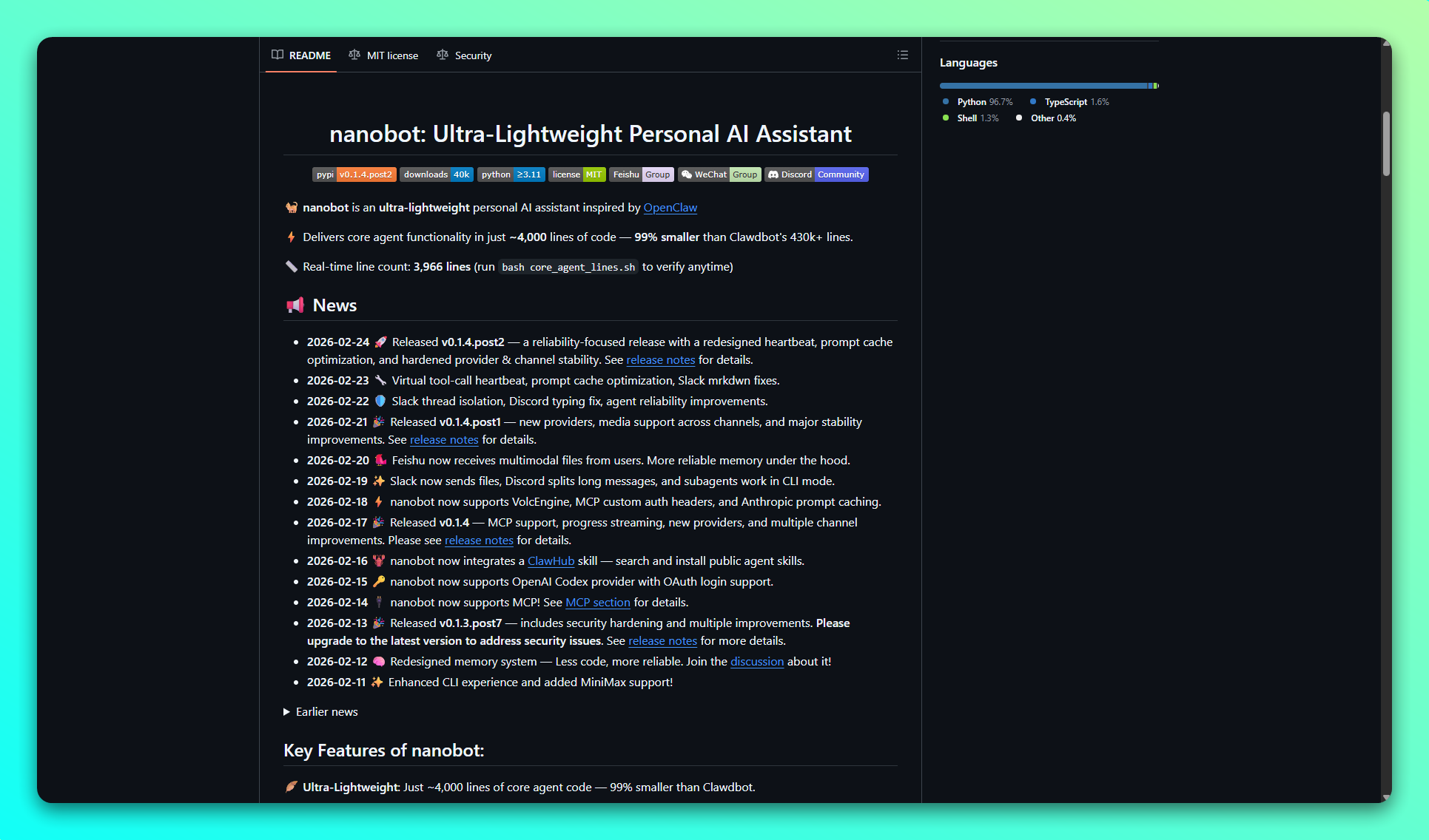 DeepSeek 导航网:Nanobot 是香港大学数据智能实验室开源的超轻量级个人 AI 助手,仅约 4000 行代码完整复刻了OpenClaw 智能体的核心功能。 Nanobot 具备网页搜索、文件操作、定时任务、记忆机制等能力,支持 24 小时实时行情分析、全栈开发、日程管理和个人知识库等场景。相比原版 43 万行代码, Nanobot 用 99% 的代码精简实现同等生产力,开发者几小时即可通读源码,快速理解 AI 调用工具与管理记忆的底层逻辑,是学习和定制 Agent 的理想选择。