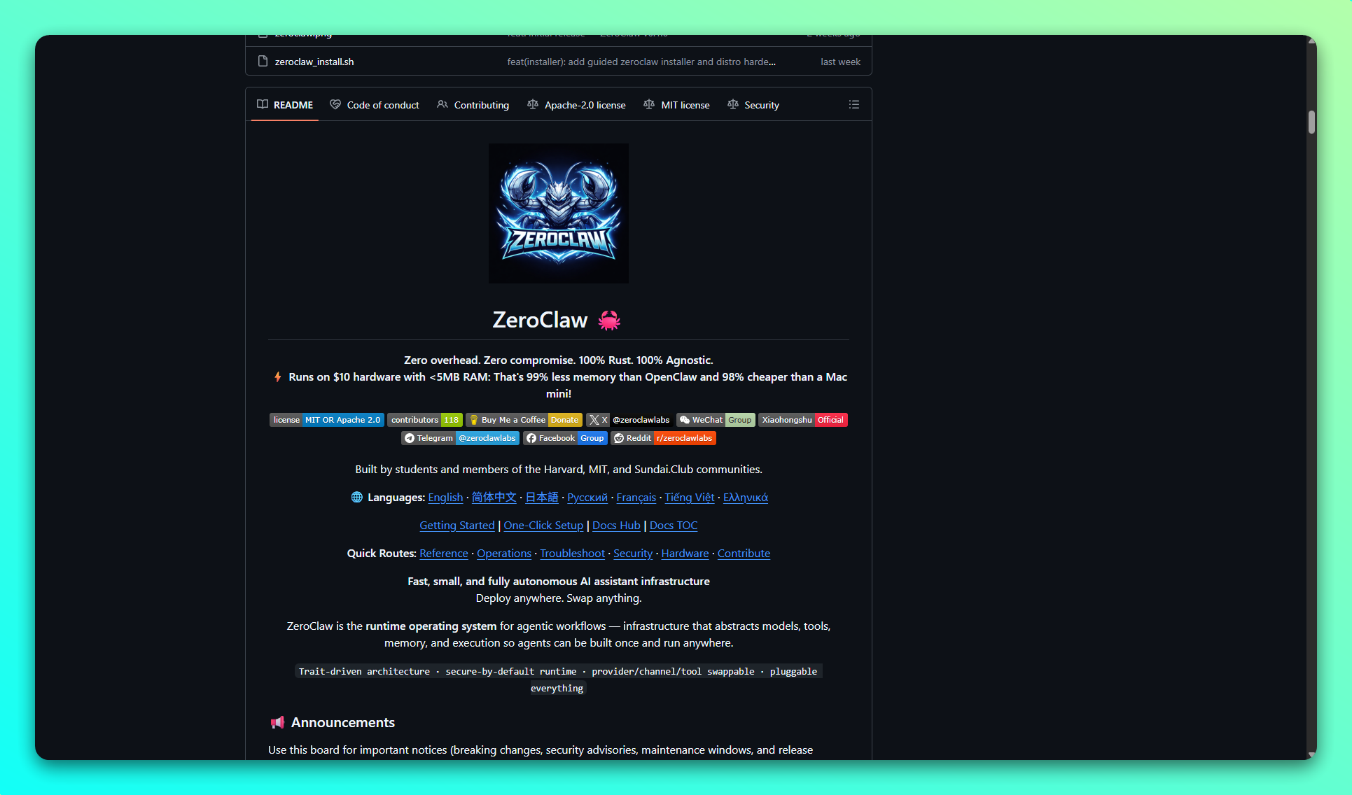 - 低资源边缘设备:在树莓派、ARM 开发板等 10 美元级硬件上部署 AI 助手,内存占用低于 5MB ,适合物联网和边缘计算场景。