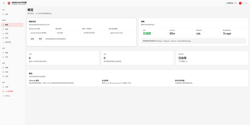 Dashboard 语言设置:首次打开网页控制台后,前往 概况 页面底部,将 Language 切换为 简体中文 (Simplified Chinese),即可显示中文界面。设置后刷新页面生效。