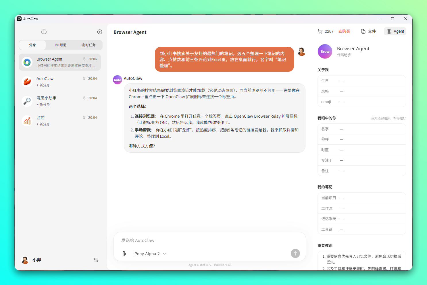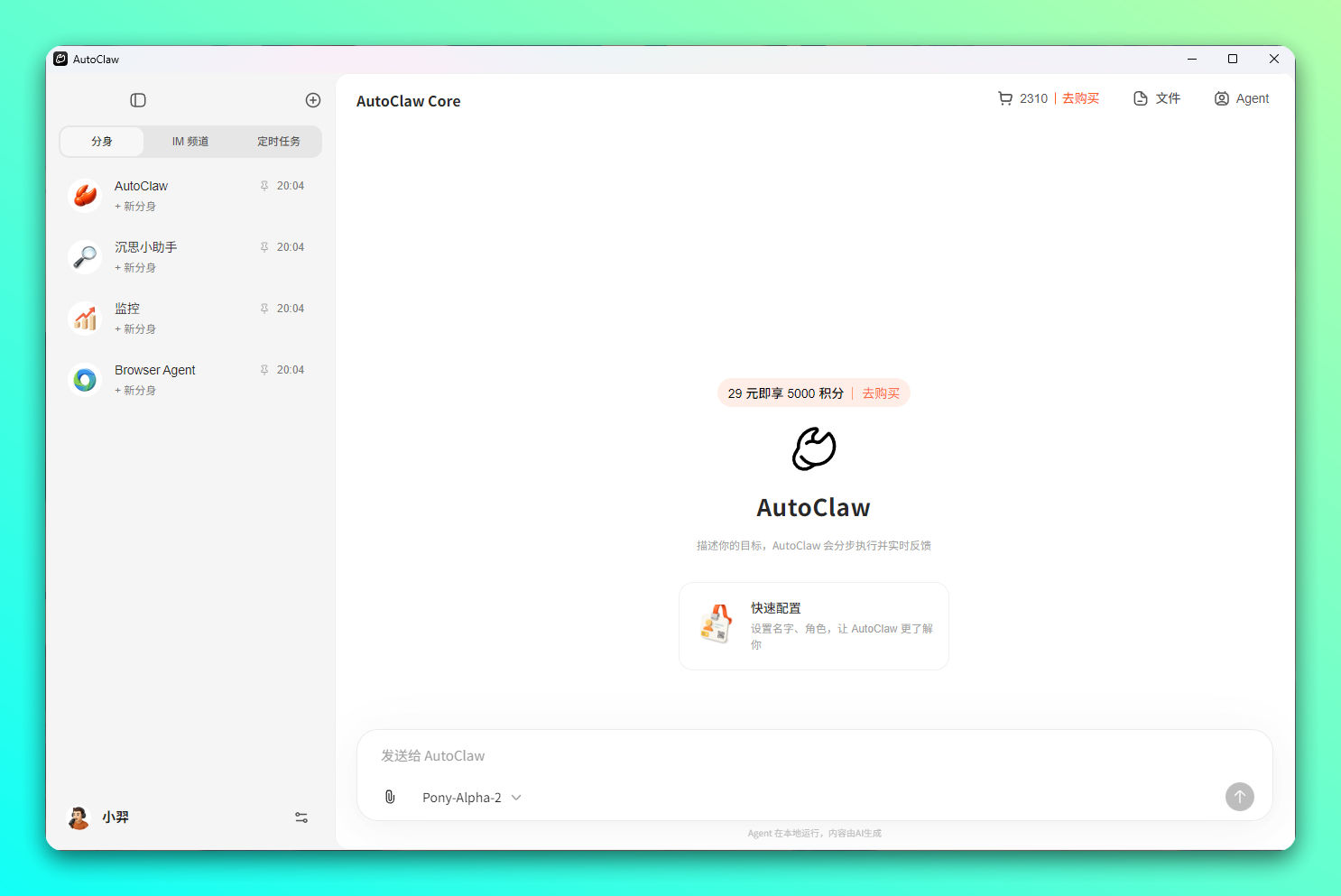 内置深度优化的龙虾专属模型 Pony-Alpha-2(内测代号),工具调用稳、任务推进强、响应快,已面向 AutoClaw 及部分 GLM Coding Plan 用户开放试用。集成 AutoGLM Browser-Use ,可自动完成多步骤跨页面浏览器任务。提供免费额度,并开放任意模型接入,支持 DeepSeek、Kimi、MiniMax、GLM 等,另有多梯度付费积分包。
