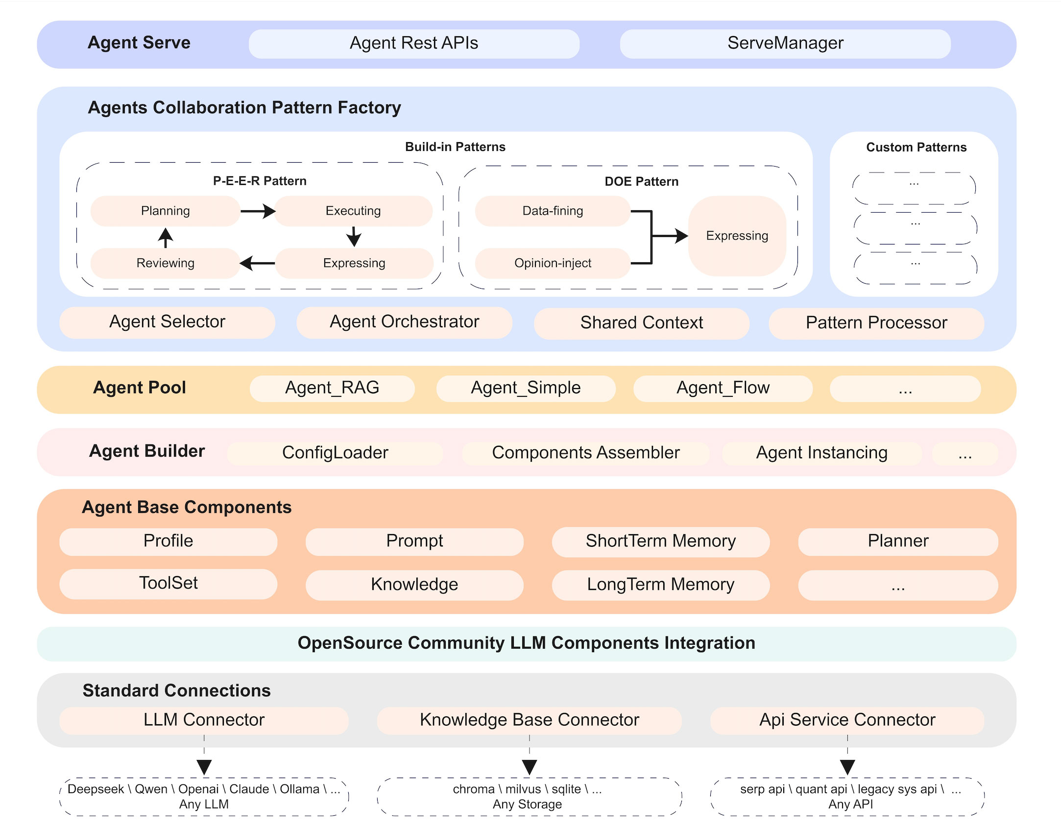 agentUniverse 提供了若干已在真实产业中验证有效的多智能体协作模式组件,其中,“PEER”是最具特色的模式之一。