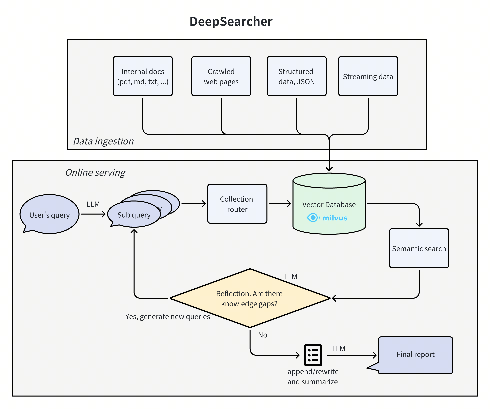 DeepSearcher 允许企业将内部私有数据(如项目文档、CAD 图纸等)通过向量数据库 Milvus 进行高效管理,避免依赖公开网络搜索,从而规避隐私泄露风险。同时支持离线模型部署,进一步保障数据安全。