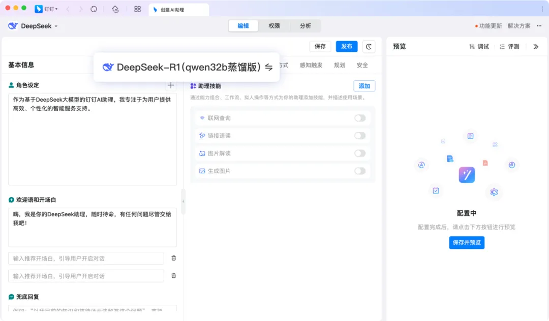 DeepSeek 导航网:钉钉 AI 助理全面接入 DeepSeek 系列模型。用户在钉钉上创建 AI 助理时,可自主选择 DeepSeeK 系列的 R1、V3 等 3 种模型。同时,钉钉还发布了全新模板,帮助用户一键创建、发布基于 DeepSeeK 模型的 AI 助理。进入钉钉主界面→点击左侧侧边栏【AI 助理】→进入钉钉 AI 助理主页→点击右侧【DeepSeek】图标。