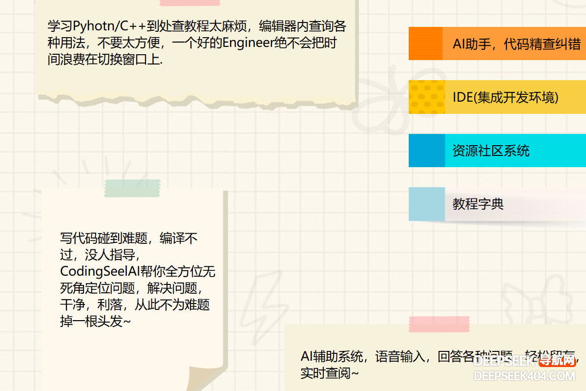 DeepSeek 导航网:CodingSee 是一款专为中国少儿编程设计的软件,内容包含社区,项目协作,站内实时消息, AI 问答, Scratch/Python/C++编译环境,代码精准纠错的集成平台, UI 设计友好,目前支持 Windows 和 mac 系统。